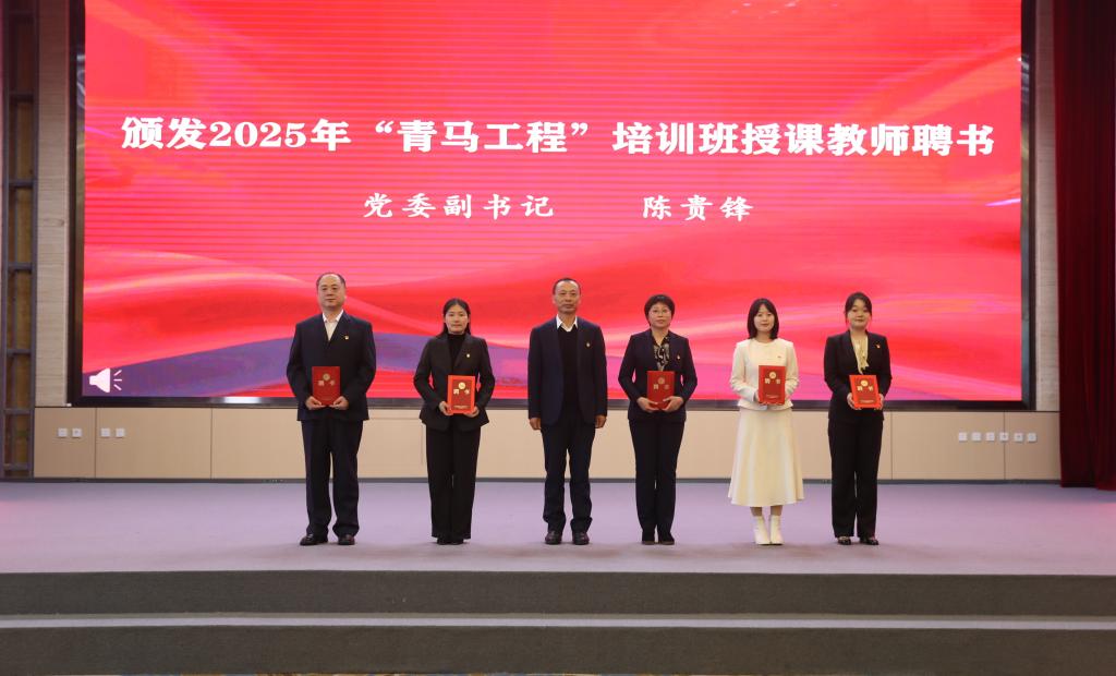 校党委副书记陈贵锋为教师颁发聘书,五位教师将在未来一年中承担理论教学、实践指导和学员培养任务。