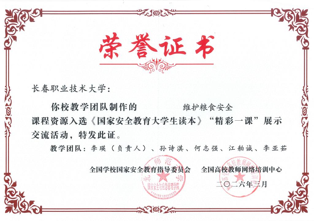 近日,教育部办公厅公布《国家安全教育大学生读本》“精彩一课” 展示交流活动入选结果,长春职业技术大学马克思主义学院教师团队报送的《维护粮食安全 守护大国粮仓》一课,凭借严谨教学设计、鲜明育人导向与优质教学呈现,成功入选全国展示课。